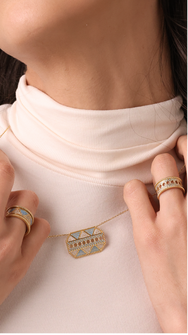 Bloks collection is inspired by the UAE heritage & contrasting geometry. The pieces are a mixture of originality and modernity, with ties that crossed the boundaries of ordinary, and layers on top of each other, each forming a story to be part of our life, "from today till forever."