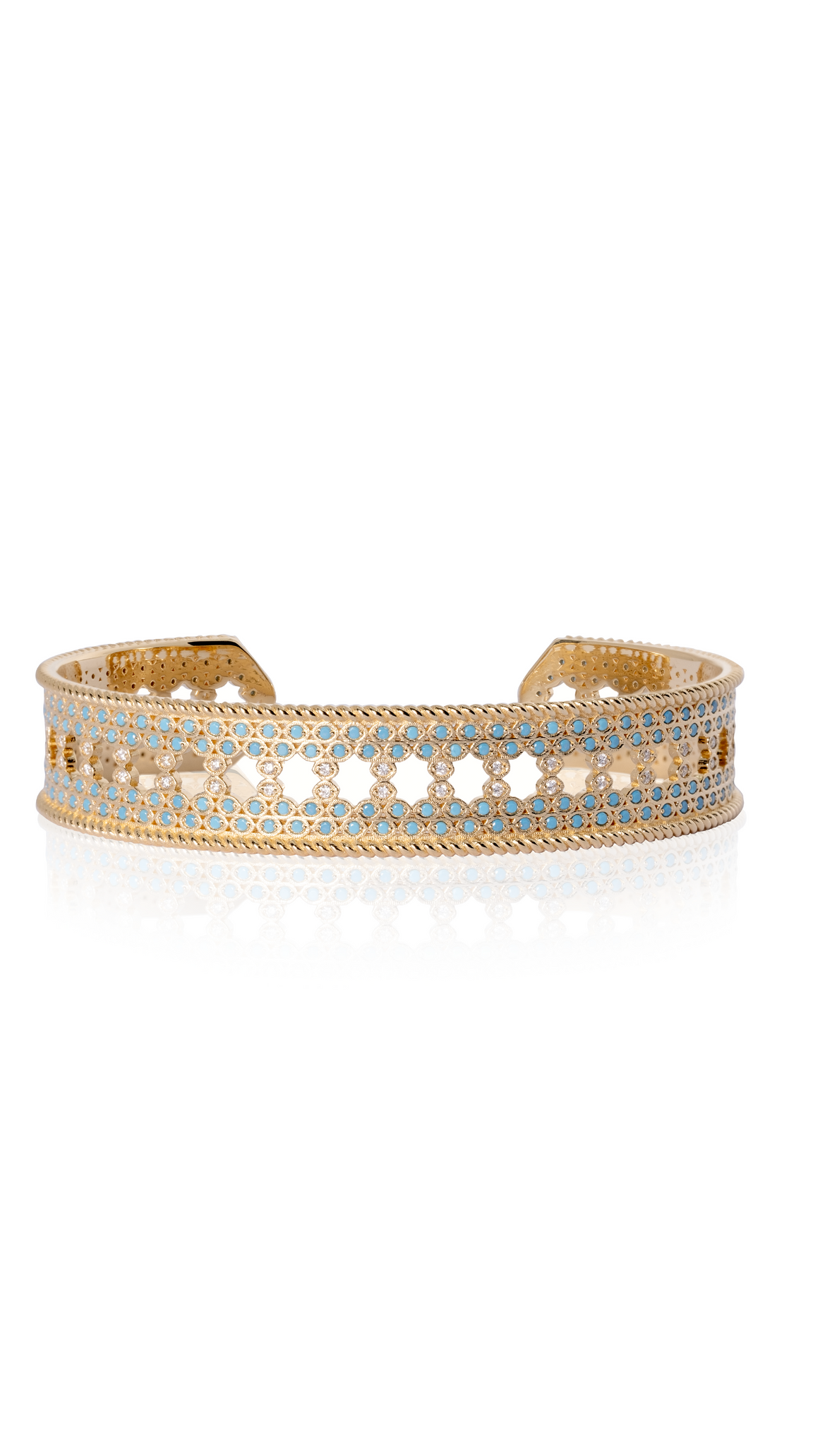 A piece was inspired from Al- Sadu which is a traditional weaving technique of the United Arab Emirates and is central to Bedouin culture. its a mix between traditional Arabic gold with twist of modernity in colors and pattern.