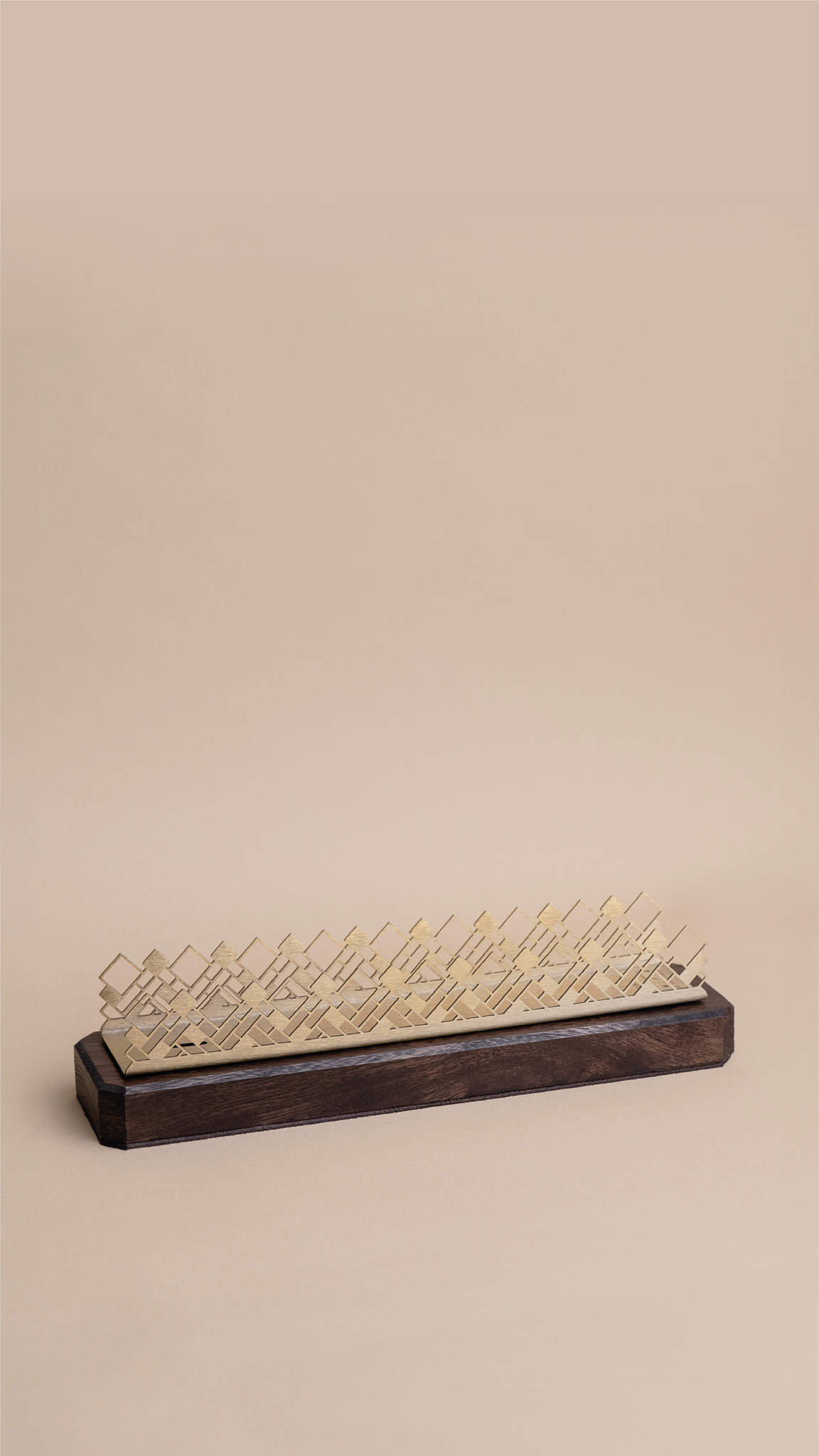 This metallic scent holder is inspired by Al khoos. It is a craft that involves weaving wicker extracted from palm fronds, which has been known since ancient times in the United Arab Emirates to make household items for daily life purposes. The wooden base is made from ghaf wood. Sustainably sourced from certified recycling and environmental conservation entities. The deformations on the wood were meant to be kept to embrace the nature of Ghaf wood and to add the antique finish